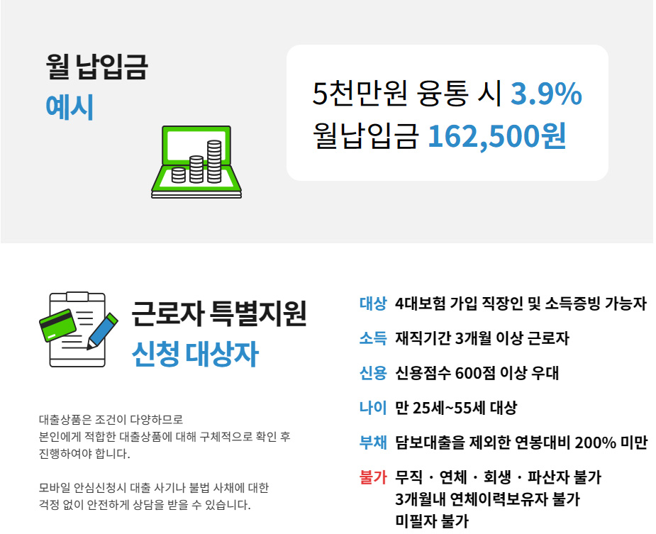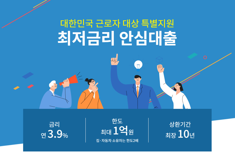 저금리 대출 희망자 또는 고금리 기대출을 이용중인 근로자 대상으로 최저금리 대환대출 금융 서비스 안내입니다. 최저금리 3.9%에 한도는 1억원(집, 자동차 소유시 한도 2배), 상환기간은 최장 10년입니다. 분기별 예산 내 선착순 지원인 만큼 필요하신 분들께서는 바로 신청 진행해보시기 바랍니다.