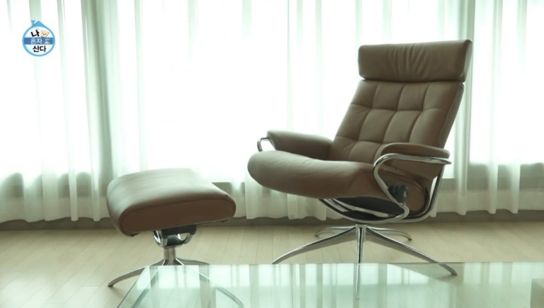 외출 후 소주 한잔 하고 편하게 앉아서 휴식을 취했던 1인용 리클라이너 소파는 바로 노르웨이 명품 리클라이너 '스트레스리스 런던'의 제품으로 보입니다. 스트레스리스만의 특허기술인 글라이딩과 전체 360도 회전 기능이 돋보입니다. 고급 천연 소가죽과 유럽산 비취목이 사용되었다고 하며 명품답게 상당한 고가임을 알 수 있습니다.