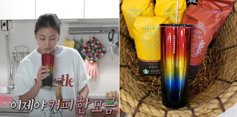 화려한 컬러감과 대용량이 눈에 띈 텀블러는 '스타벅스 북미 선셋 스텐레스 스틸 콜드컵 24oz 벤티사이즈' 입니다.