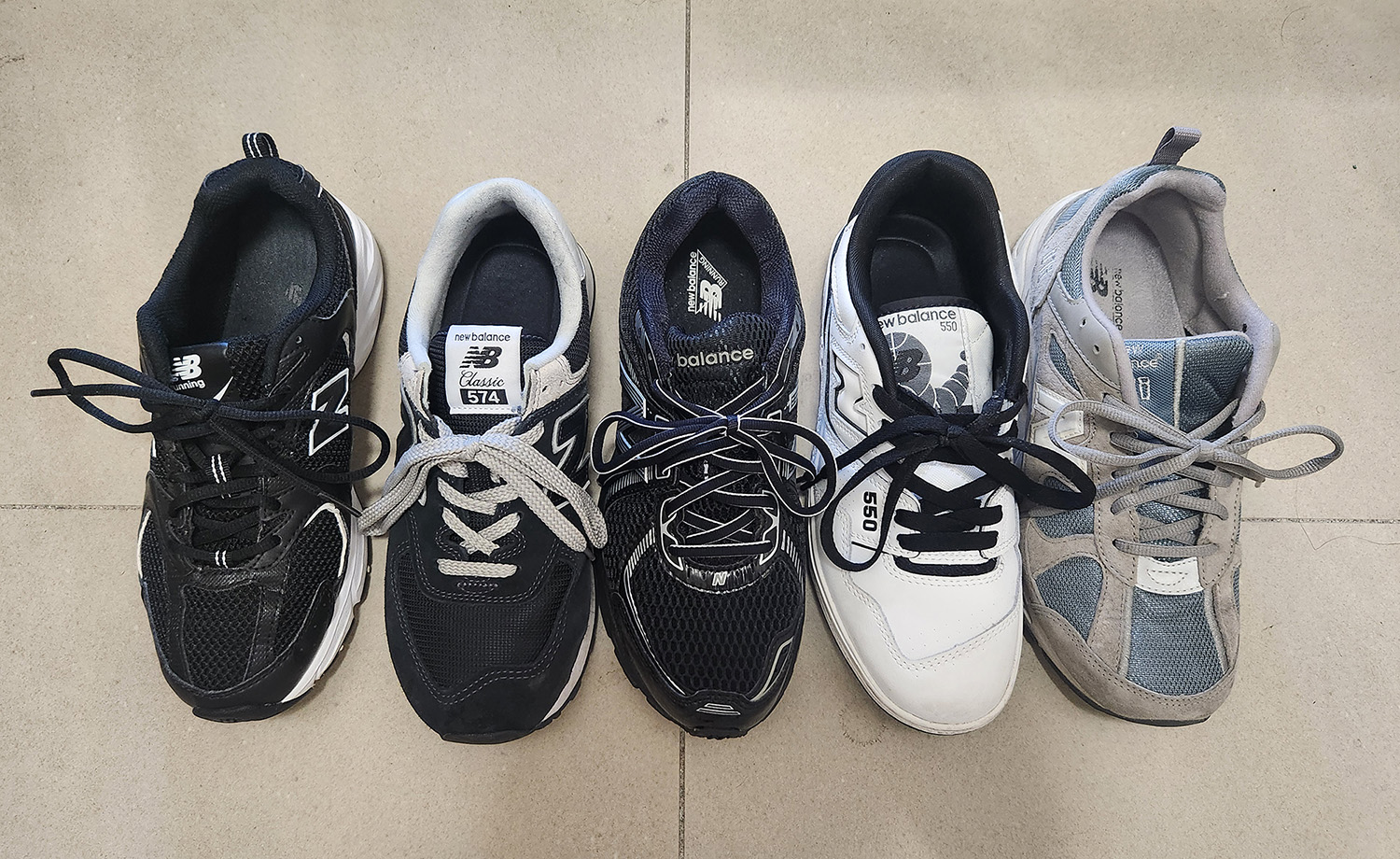 위의 사진은 제가 가지고 있는 뉴발란스 운동화이며 왼쪽부터 530 / 574 / 860v2 / 550 / 878 이며 530을 제외한 나머지는 모두 255mm 입니다. (530만 정사이즈인 250mm 입니다.)