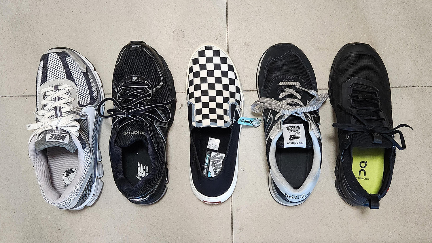 왼쪽부터 나이키 줌 보메로5 / 뉴발란스 860v2 / 반스 컴피쿠시 원 / 뉴발란스 574 / 온러닝 클라우드 울트라2 이며 모두 사이즈 255mm입니다.