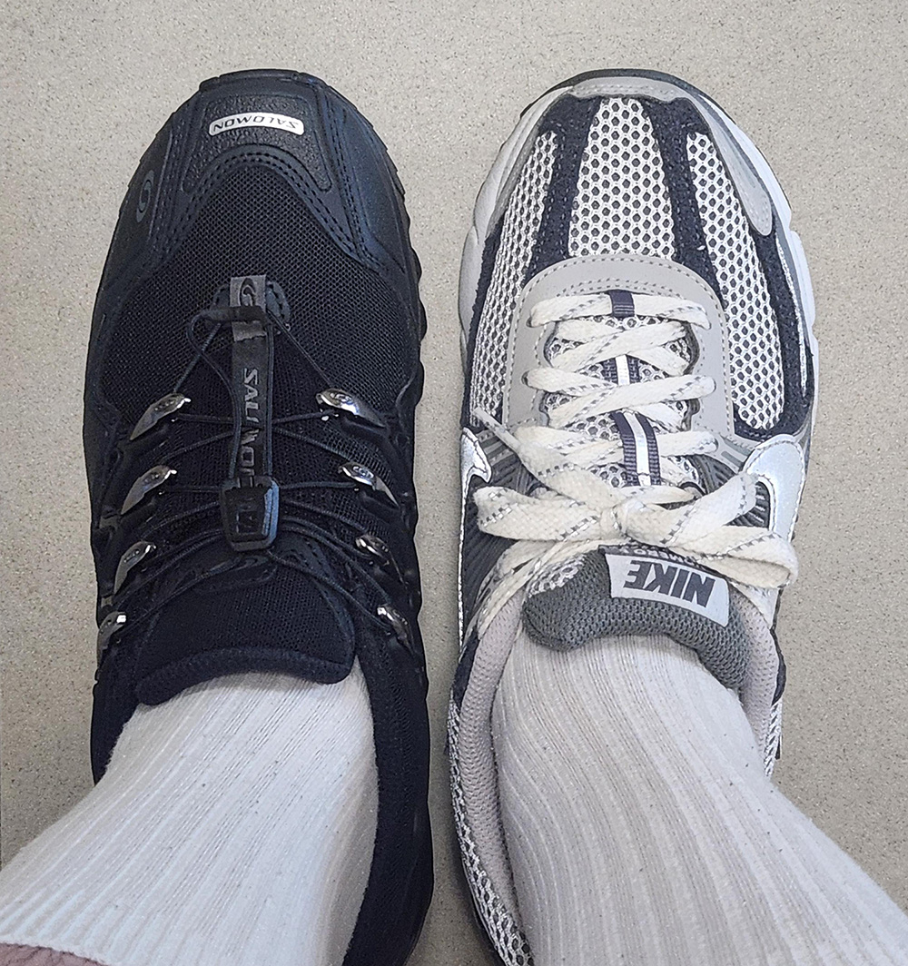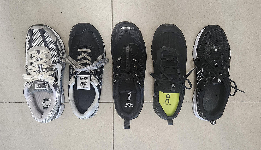 왼쪽부터 나이키 줌 보메로5 / 뉴발란스 574 / 살로몬 ACS+ / 온러닝 클라우드 울트라2 / 뉴발란스 530 이며 제일 오른쪽의 530을 제외한 나머지는 모두 사이즈 255mm입니다. (530은 250mm입니다.)