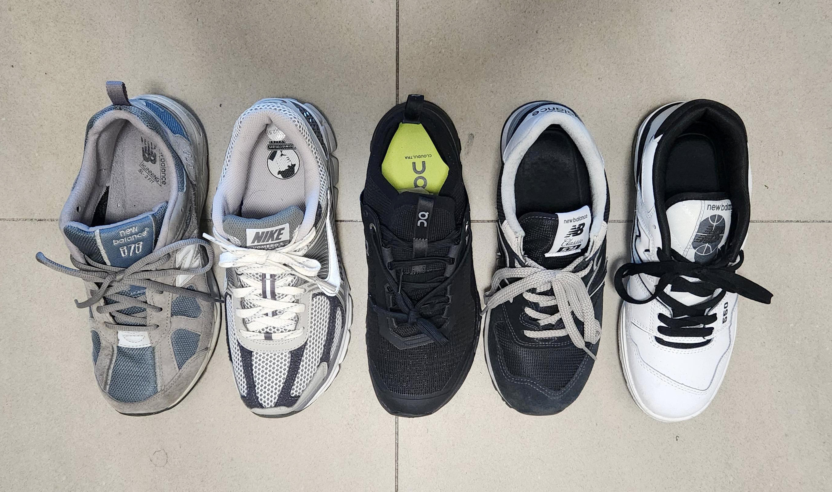 왼쪽부터 뉴발란스 878 / 나이키 줌 보메로5 / 온러닝 클라우드 울트라2 / 뉴발란스 574 / 뉴발란스 550 이며 5켤레 사이즈 모두 255mm 입니다.